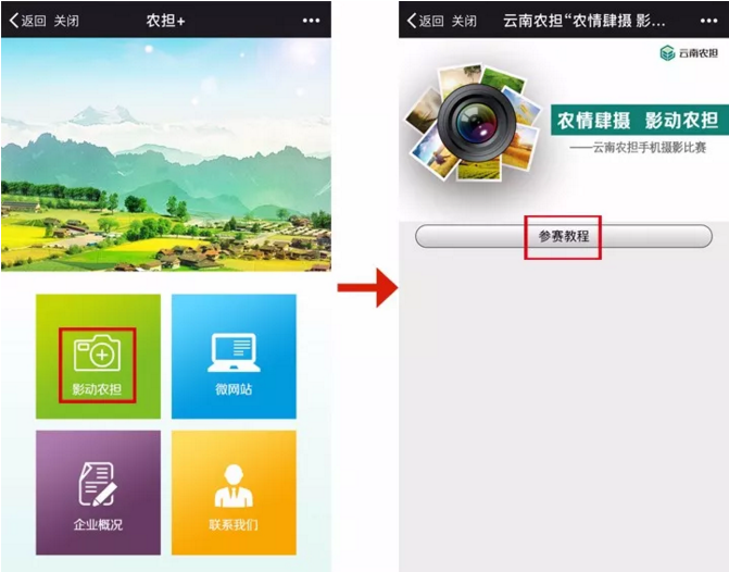 參與方式二:關(guān)注“云南農(nóng)擔(dān)”官方微信號,點(diǎn)擊“農(nóng)擔(dān)+”欄目,選擇“影動農(nóng)擔(dān)”進(jìn)入,查看教程后,完成信息錄入,在對話框內(nèi)發(fā)送1張圖片及一句話描述即可。