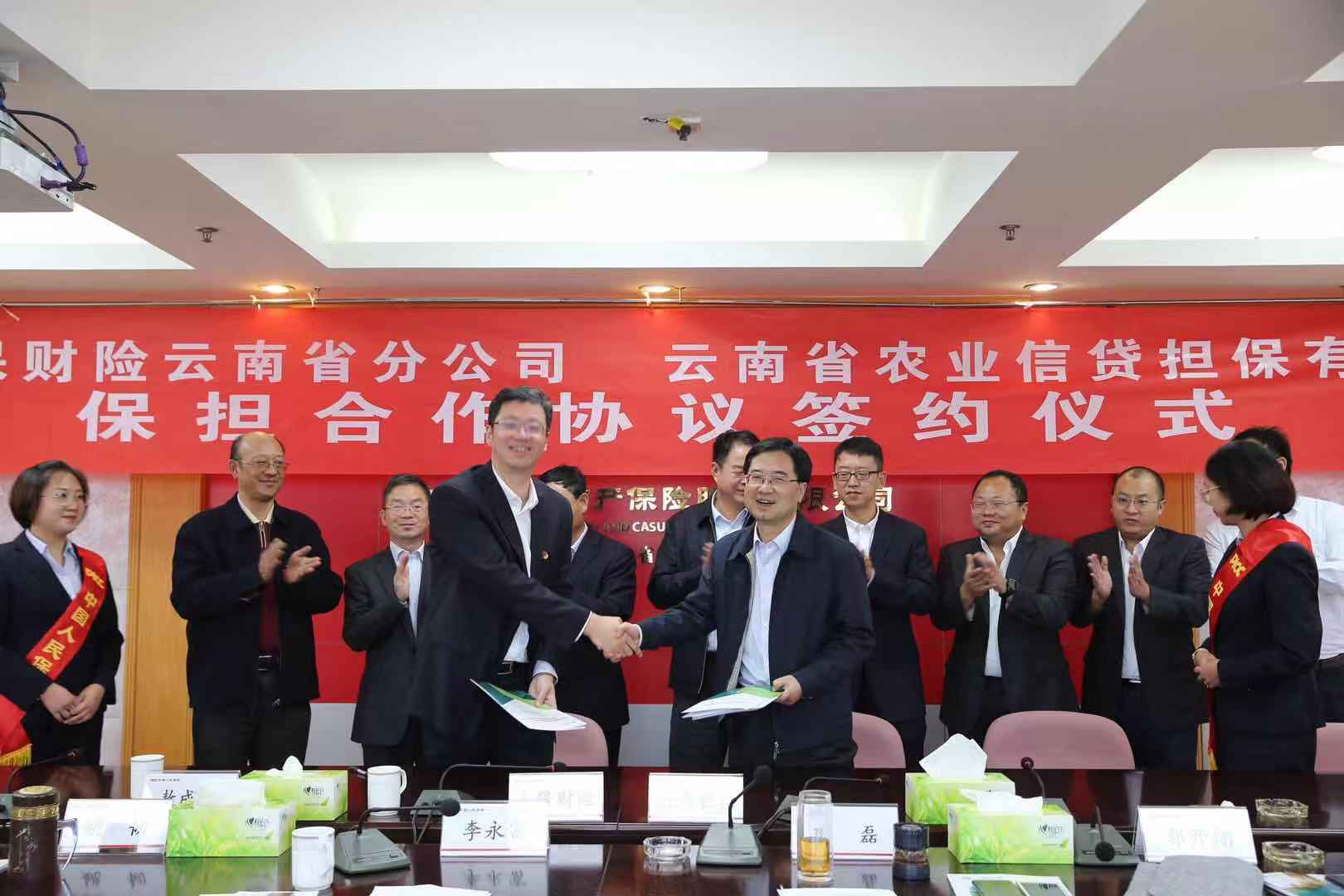 10月19日下午,公司與中國(guó)人保財(cái)險(xiǎn)云南省分公司舉行了保擔(dān)合作協(xié)議簽約儀式。公司郭影董事長(zhǎng)、杜開波總經(jīng)理、敖成碧副總經(jīng)理、人保財(cái)險(xiǎn)云南省分公司黨委書記、總經(jīng)理雙磊、副總經(jīng)理李永富出席儀式,雙方有關(guān)部門負(fù)責(zé)人參加了活動(dòng)。