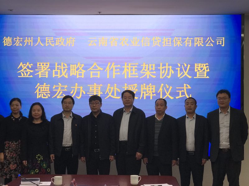 12月19日上午,德宏州人民政府、云南農(nóng)擔(dān)公司簽署戰(zhàn)略合作框架協(xié)議暨德宏辦事處授牌儀式在芒市會(huì)堂舉行。德宏州委常委、常務(wù)副州長(zhǎng)馬云峰,農(nóng)擔(dān)公司董事長(zhǎng)郭影、總經(jīng)理杜開波、機(jī)構(gòu)部負(fù)責(zé)人蔡菲、德宏州財(cái)政局、農(nóng)業(yè)局、人行德宏支行、德宏銀監(jiān)分局、農(nóng)行德宏分行、省聯(lián)社德宏辦、各縣市政府等相關(guān)單位參加會(huì)議。