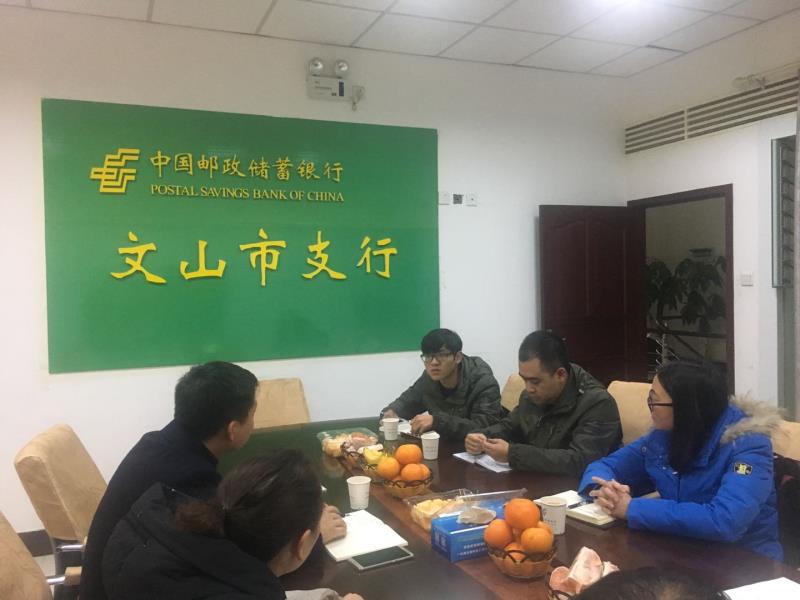2019年1月8日,文山辦事處全體員工受邀到中國郵政儲蓄銀行文山市支行進(jìn)行座談,中國郵政儲蓄銀行文山州分行三農(nóng)金融部總經(jīng)理、文山市支行行長李洪,文山市支行信貸部主任李順成以及信貸客戶經(jīng)理參加座談。