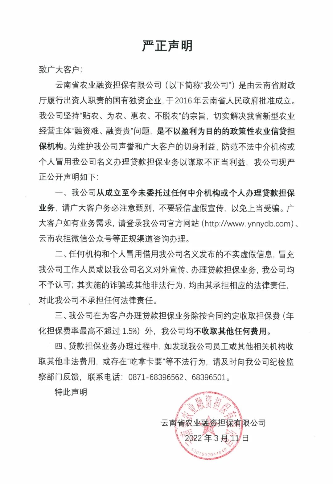 云南省農(nóng)業(yè)融資擔保有限公司嚴正聲明